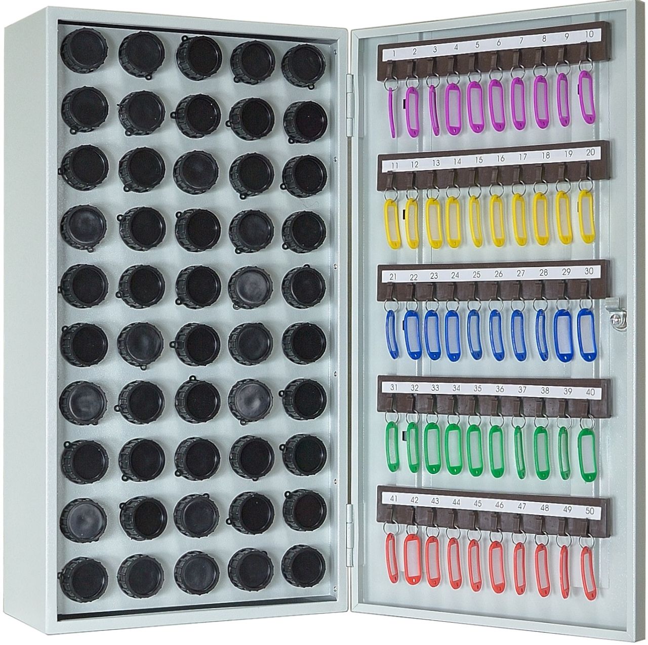 Ключница КЛ-50П предназначена для хранения 50 комплектов ключей и 50 пеналов. На задней стенке корпуса расположены отверстия для крепления. Ключница комплектуется 5 планками под навеску ключей. В дверь установлен замок типа «Cam-Lock». По желанию заказчика пенальница может комплектоваться пеналами.