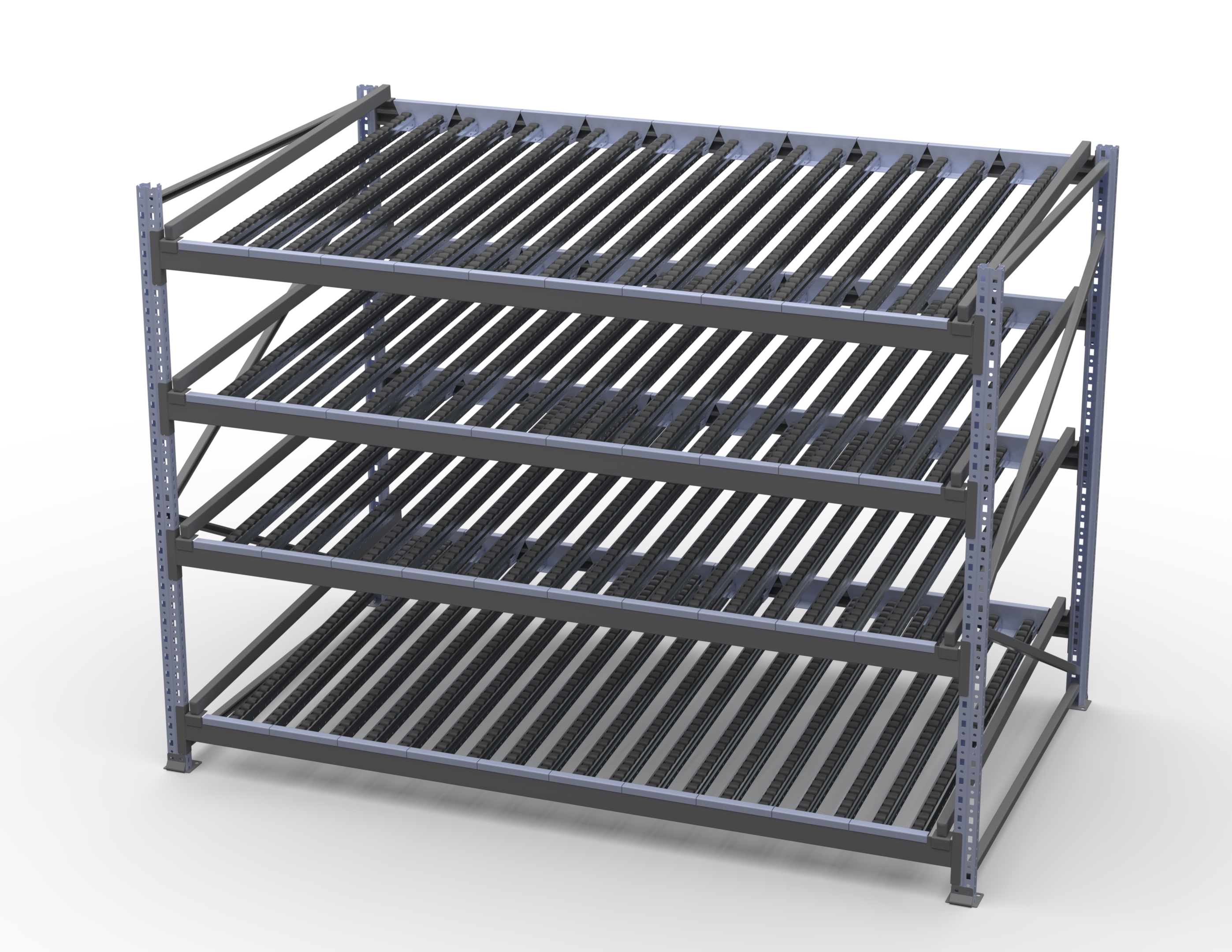 Гравитационный стеллаж с роликовыми полками 1600х2100х1300, 4 яруса