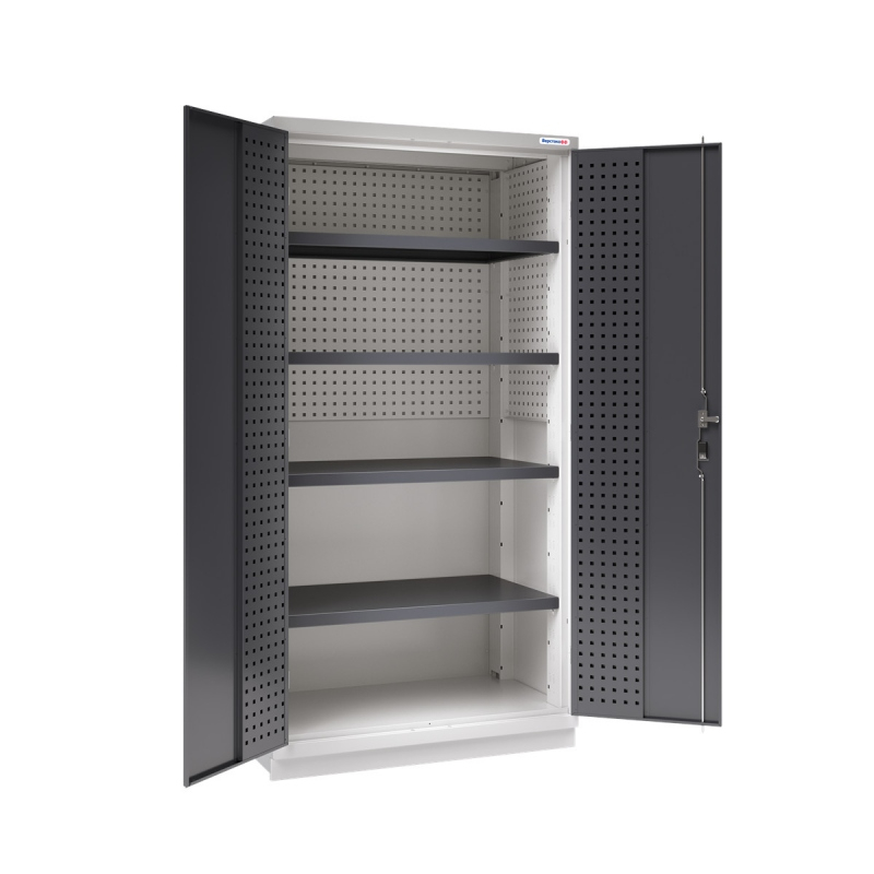 Шкаф инструментальный Fabrik тяжёлой серии представляет собой сборно-разборную конструкцию, предназначен для хранения оснастки, приспособлений и инструмента в мастерских, цехах и других производственных зонах. Шкаф изготовлен из листовой стали и обеспечивает надежное запирание дверей ригельной системой.