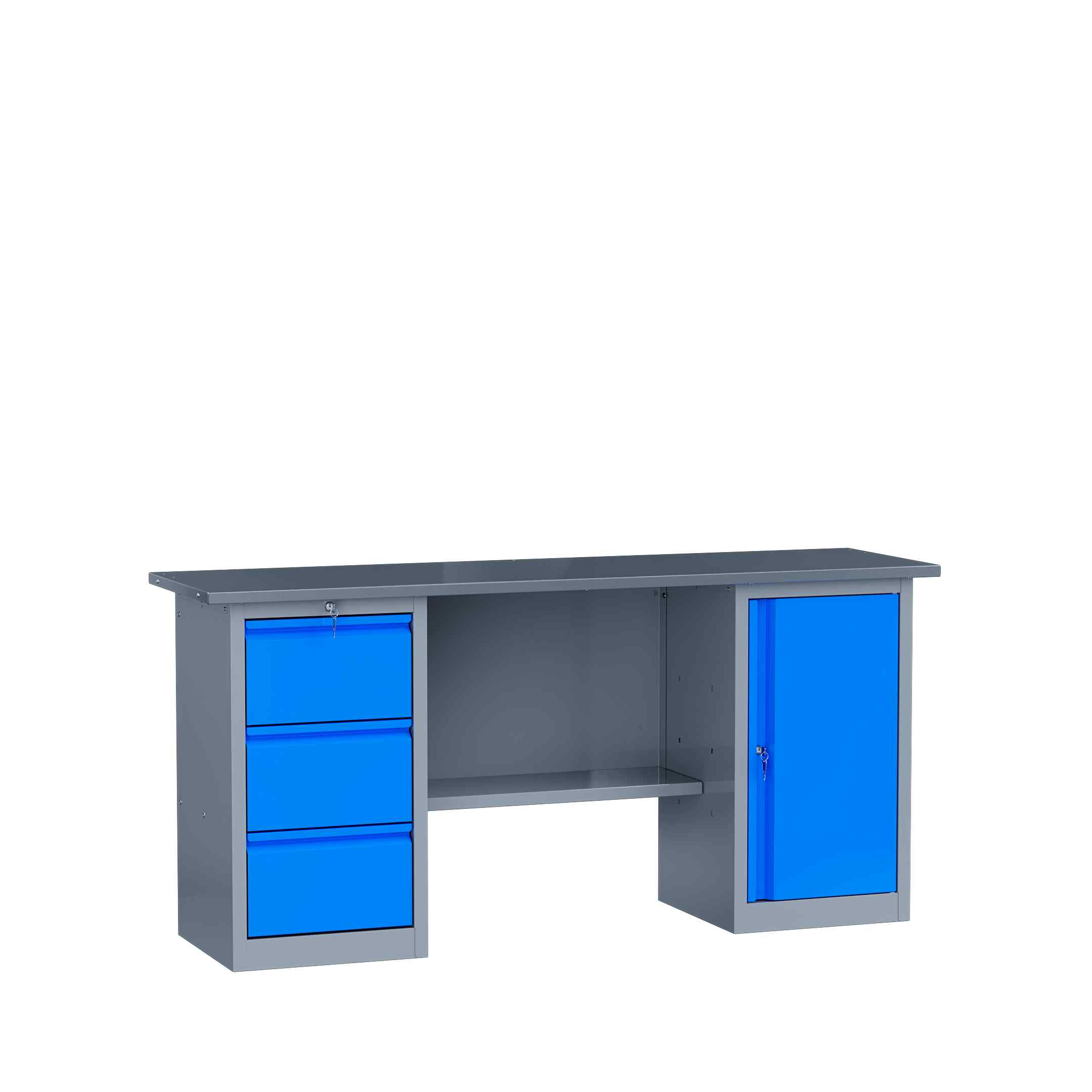 В двухтумбовом рабочем столе предусмотрено 3 выдвижных ящика для удобного хранения инструментов и расходных материалов. Под столешницей расположена полка для размещения дополнительного оборудования, которое должно находиться под рукой для регулярного использования.