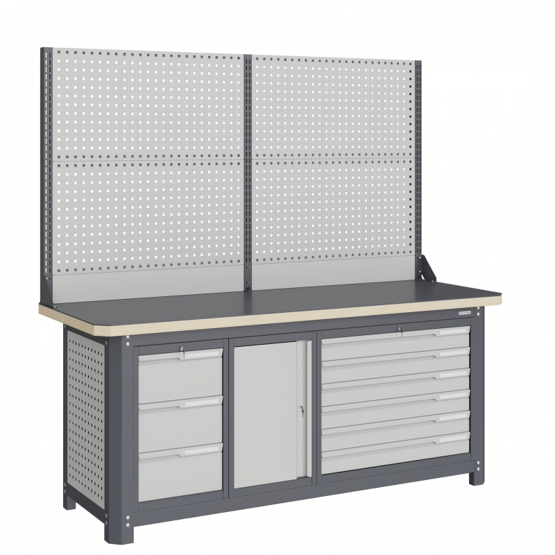 Экран (перфорированная панель) верстака выполнен с квадратной перфорацией 12х12 мм с шагом 38 мм для установки крючков, держателей и других аксессуаров. Экран крепятся к столешнице с помощью специальных кронштейнов. Максимальная масса груза, равномерно распределенного по поверхности экрана, составляет 71 кг.