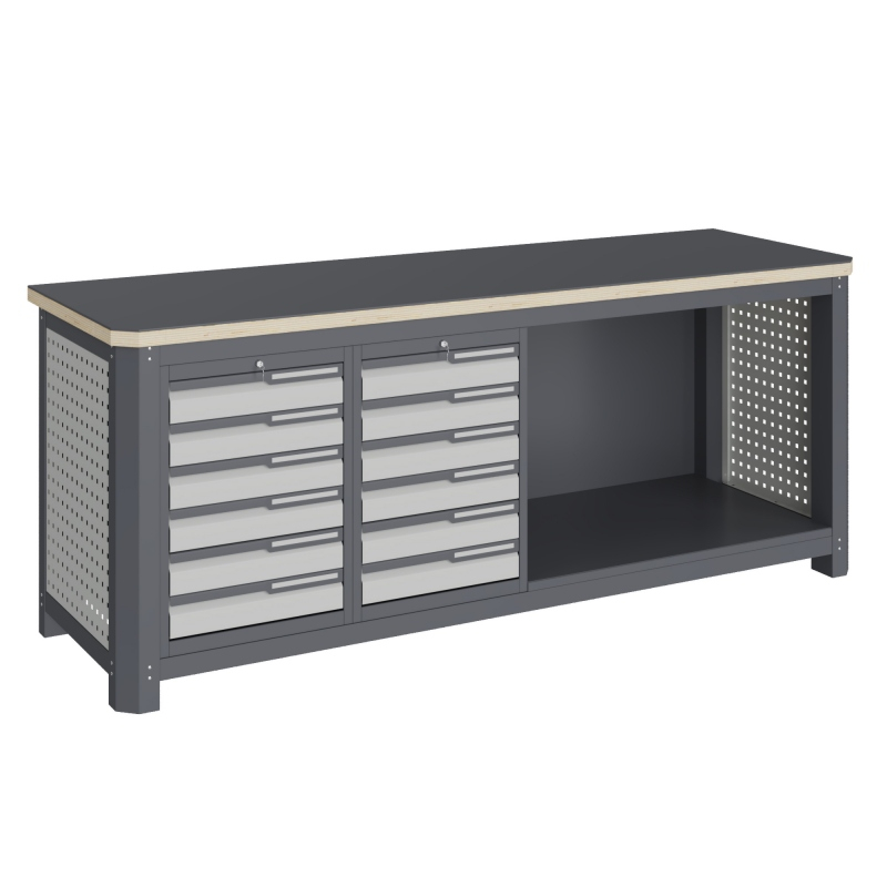 Верстак серии MECHANIC: MCN 2052.S66.11 состоит из столешницы шириной 1993 мм, рамы верстака, состоящей из опор, перемычек, боковых перфопанелей, двух малых модулей S6 и двух комплектов полка-стенка SW1.