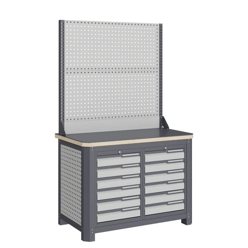 Рабочее место MECHANIC: MCN 1252.S66-2 состоит из столешницы шириной 1193 мм, рамы верстака, состоящей из опор, перемычек, боковых перфопанелей, двух небольших модулей с ящиками S6, двойного экрана с кронштейнами.