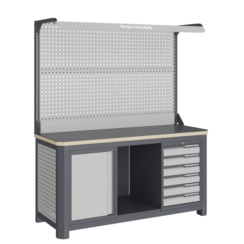 Верстак серии MECHANIC: MCN 1552.S67.1-2F состоит из столешницы шириной 1493 мм, рамы верстака, состоящей из опор, перемычек, боковых перфопанелей, малых модулей S6, S7 и комплекта полка-стенка SW1, двойного экрана с кронштейнами и комплектом освещения.