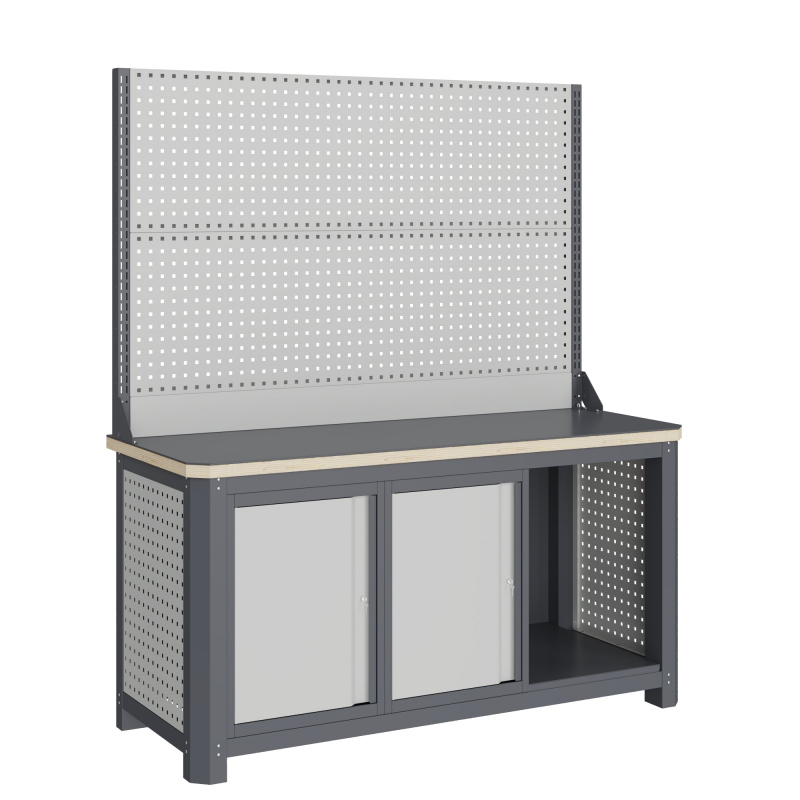 Верстак серии MECHANIC: MCN 1552.S77.1-2 состоит из столешницы шириной 1493 мм, рамы верстака, состоящей из опор, перемычек, боковых перфопанелей, малых модулей S7 и комплекта полка-стенка SW1, двойного экрана с кронштейнами.
