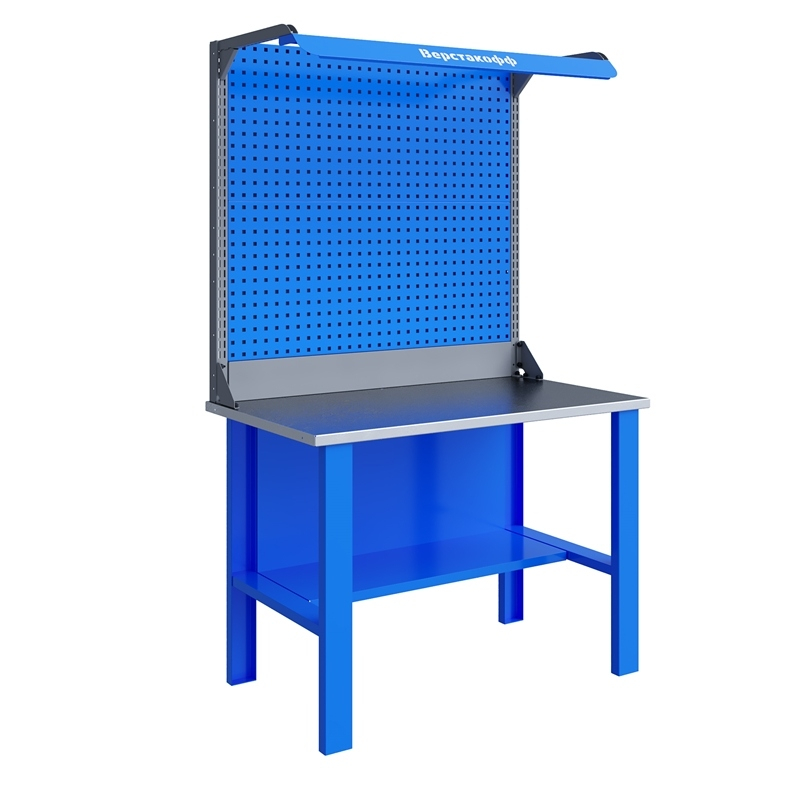 Верстак имеет декларацию соответствия ТР ТС 025/2012 «О безопасности мебельной продукции». Верстак имеет сертификат соответствия ГОСТ Р 58863-2020 «Столы производственные. Верстаки из металла. Общие технические условия». Столешница состоит из листа влагостойкой фанеры марки ФСФ толщиной 24 мм, которая покрыта лаком-антисептиком и листом оцинкованной холоднокатаной стали толщиной 1,2 мм. Глубина столешниц 696 мм. Двойной экран (перфорированные панели) верстака выполнен с квадратной перфорацией 12х12 мм с шагом 38 мм для установки крючков, держателей и других аксессуаров. Экран крепится к столешнице с помощью специальных кронштейнов. Комплект освещения устанавливается над верстаком. В комплекте: защитный козырек, кронштейны и лампа с магнитными креплениями, которые позволяют менять ее положение.