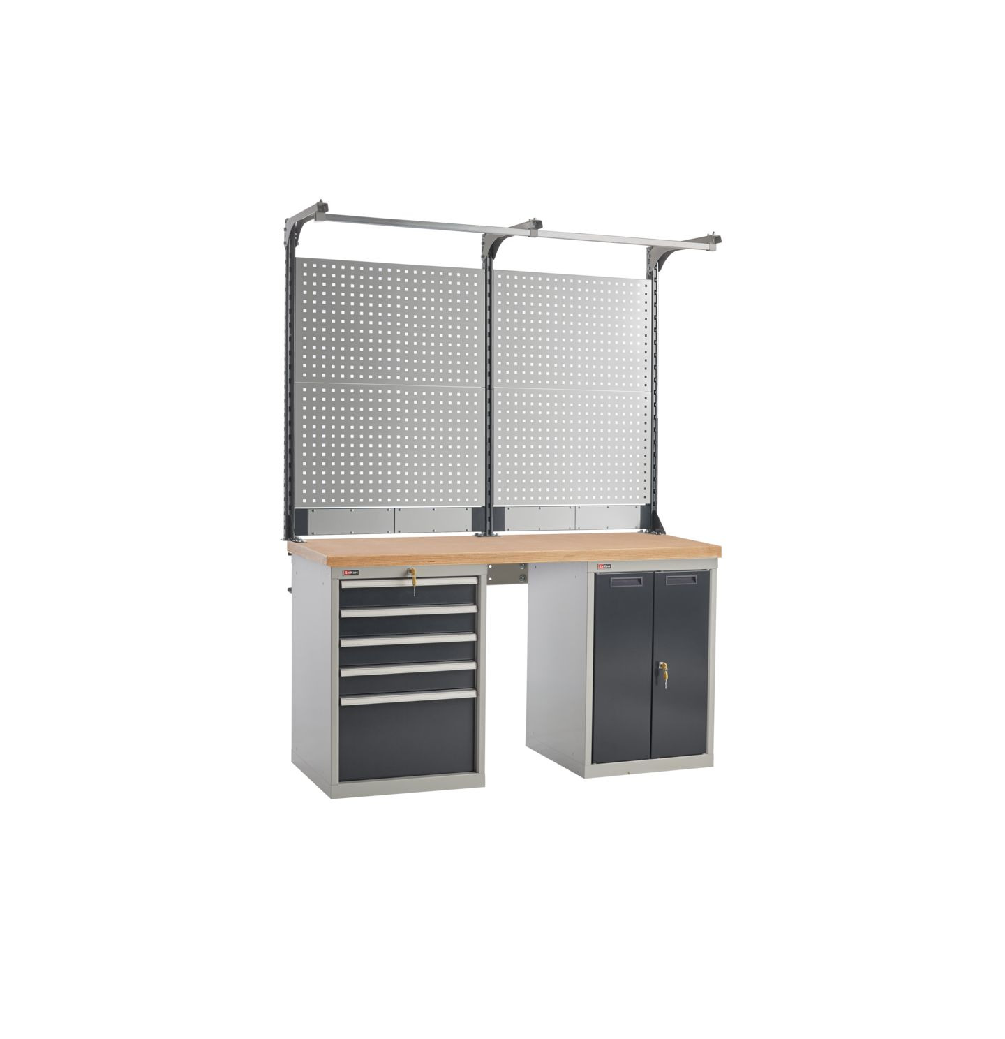 Металлические элементы верстаков окрашены эпоксидной порошковой краской, устойчивой к механическим воздействиям и агрессивным жидкостям. Ящики, дверцы тумб и стойки экрана – цвет антрацитово-серый RAL 7016, остальные элементы – цвет серый RAL 7038.